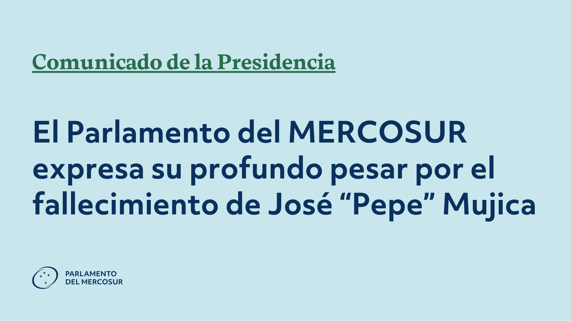 Comunicado de la Presidencia (13/05/2025). La Presidencia del Parlamento del MERCOSUR expresa, con profundo pesar, el fallecimiento del ex Presidente de la República Oriental del Uruguay, José "Pepe" Mujica.