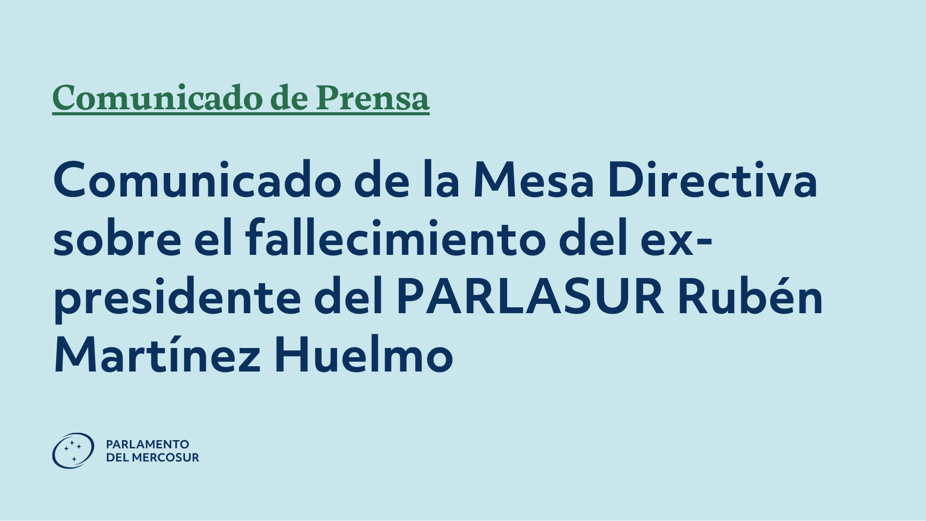 Comunicado de Prensa (04/11/2025). La Mesa Directiva del Parlamento del MERCOSUR (PARLASUR) expresa su profundo pesar por el fallecimiento del expresidente del PARLASUR y exsenador uruguayo, Rubén Martínez Huelmo, ocurrido el 3 de noviembre de 2025, a los 76 años.