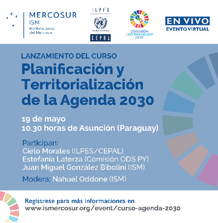El próximo 19 de mayo, a las 10:30hs de Asunción, Paraguay, la Escuela de Gobierno del Instituto Social del MERCOSUR (ISM), junto al Instituto Latinoamericano de Planificación Económica y Social (ILPES/CEPAL) y la Comisión ODS Paraguay realizarán el lanzamiento del nuevo curso "Planificación y Territorialización de la Agenda 2030".