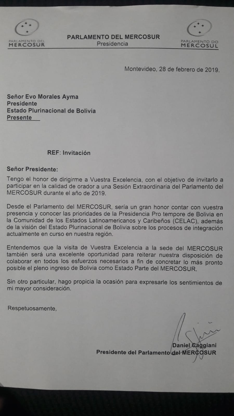 Cabe destacar que el Presidente del Parlamento del MERCOSUR, el Parlamentario Daniel Caggiani, aprovechó dicho encuentro para invitar al Presidente Evo Morales para compartir las experiencias sobre el rol integrador de Bolivia. "Queremos aprovechar para invitar al Presidente Evo Morales al PARLASUR, Bolivia hoy tiene la presidencia de la CELAC, una de las más importantes instituciones de integración porque integra a todos los países de América Latina y El Caribe, a más de 600 millones de personas, y que tiene sobre todo un rol fundamental de articular esa mirada, ese diálogo productivo, no solo con Europa sino con China y creo que es importante también poder contar con la tuición de Bolivia para la construcción de este proceso de integración” comentó Caggiani.